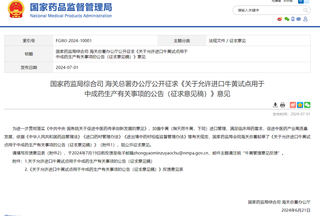 为进一步贯彻落实《中共中央 国务院关于促进中医药传承创新发展的意见》,加强牛黄(指天然牛黄,下同)进口管理,满足临床用药需求,促进中医药产业高质量发展,依据《中华人民共和国药品管理法》《进口药材管理办法》《进出境中药材检疫监督管理办法》等有关规定,国家药监局会同海关总署起草了《关于允许进口牛黄试点用于中成药生产有关事项的公告(征求意见稿)》,现公开征求意见。截止日期:2024年7月19日