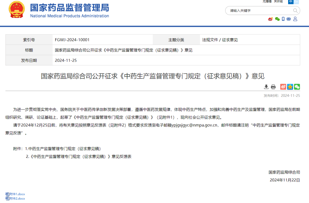 国家药监局综合司公开征求《中药生产监督管理专门规定(征求意见稿)》意见