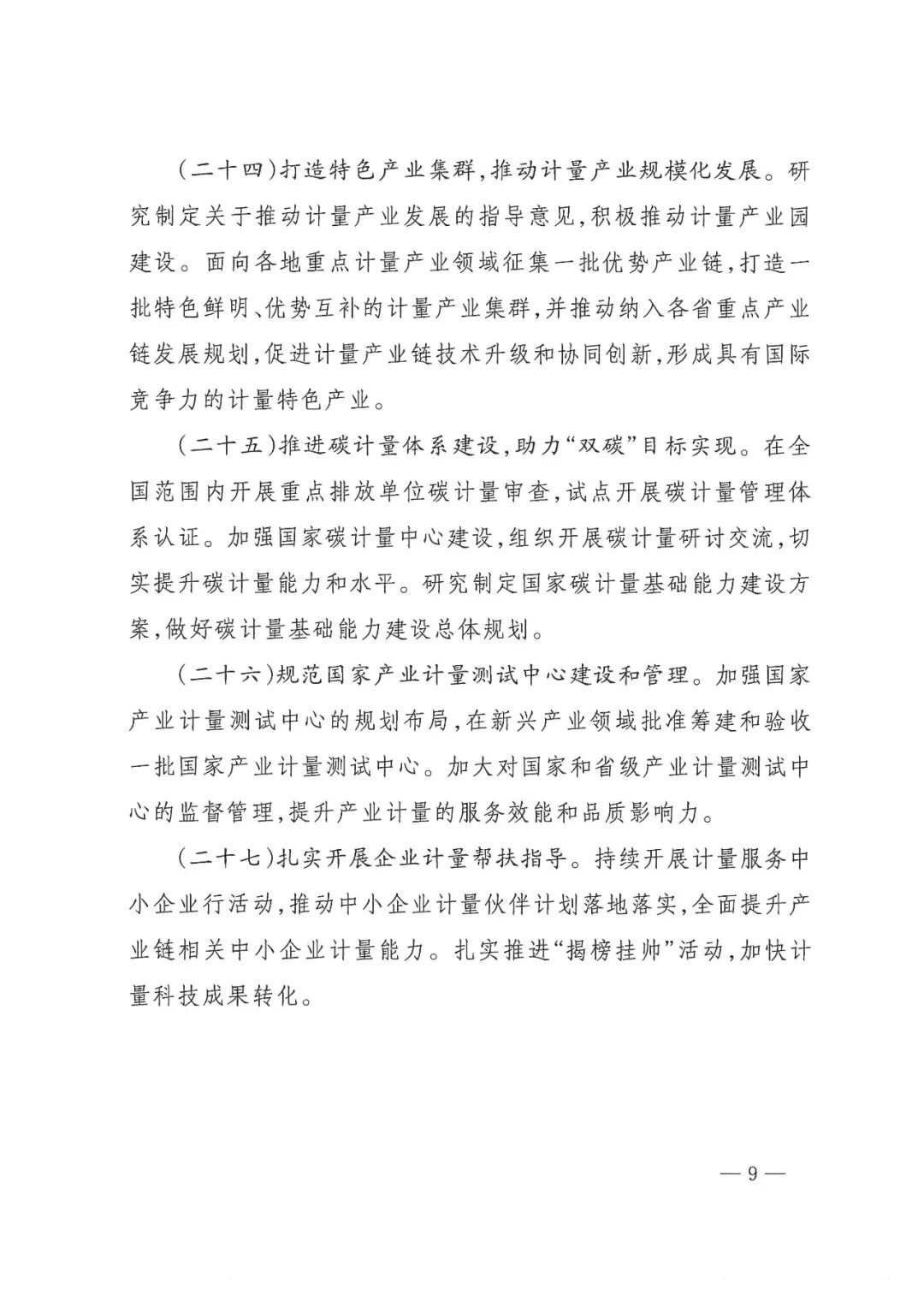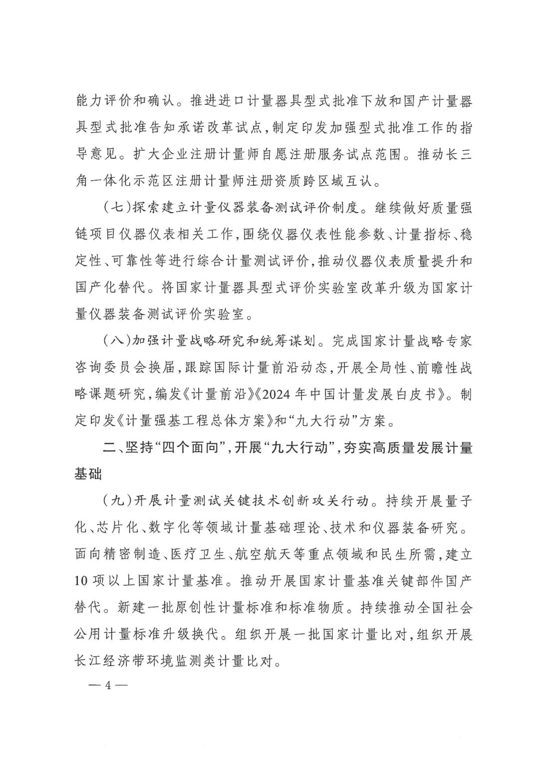 1月28日,国家市场监管总局官网刊发《2025年全国计量工作要点》。《工作要点》明确:2025 年是“十四五”规划的收官之年,也是将全面深化改革推向纵深的关键之年。全国计量工作的总体思路是:以习近平新时代中国特色社会主义思想为指导,以贯彻落实习近平总书记关于计量工作重要论述为统领,以推动落实《计量发展规划(2021-2035 年)》(以下简称《规划》)、加快实施计量强基工程为主线,加强党建引领,深化改革创新,坚持“四个面向”,开展“九大行动”,聚焦问题、瞄准目标、狠抓落实;依托计量重点单位,归集计量重大需求,推动落实计量重大项目,健全完善计量工作高水平协同联动机制(以下简称“三重一协同”);凝心聚力,担当作为,为高质量发展提供有力计量支撑。